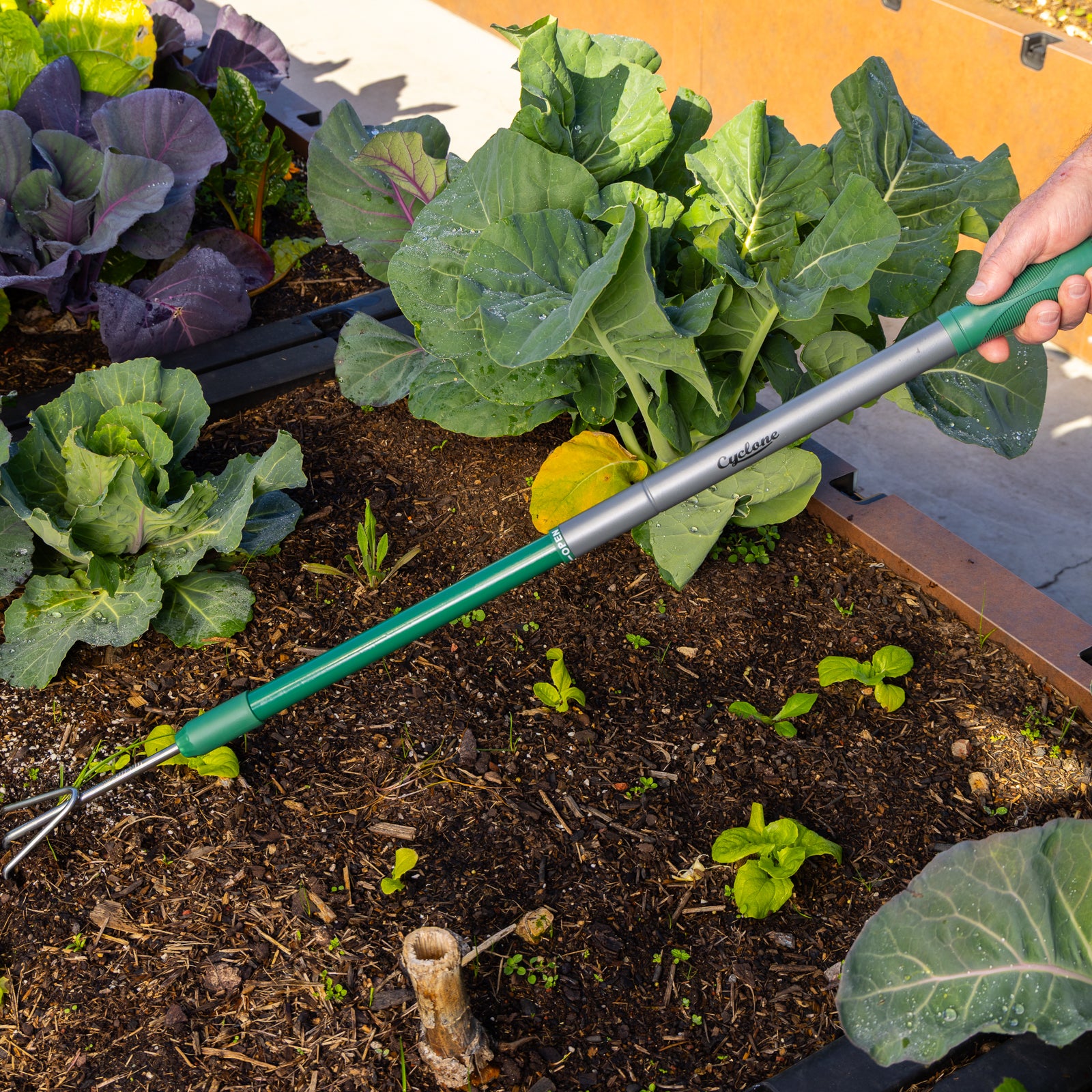 The Cyclone Stainless Steel Telescopic Hand Cultivator is ideal for breaking up soil, weeding, and aerating garden beds. It features a stainless steel head for strength and durability, and a telescopic handle that adjusts for comfort and reach, making it perfect for working in tight spaces or reducing strain during gardening tasks.